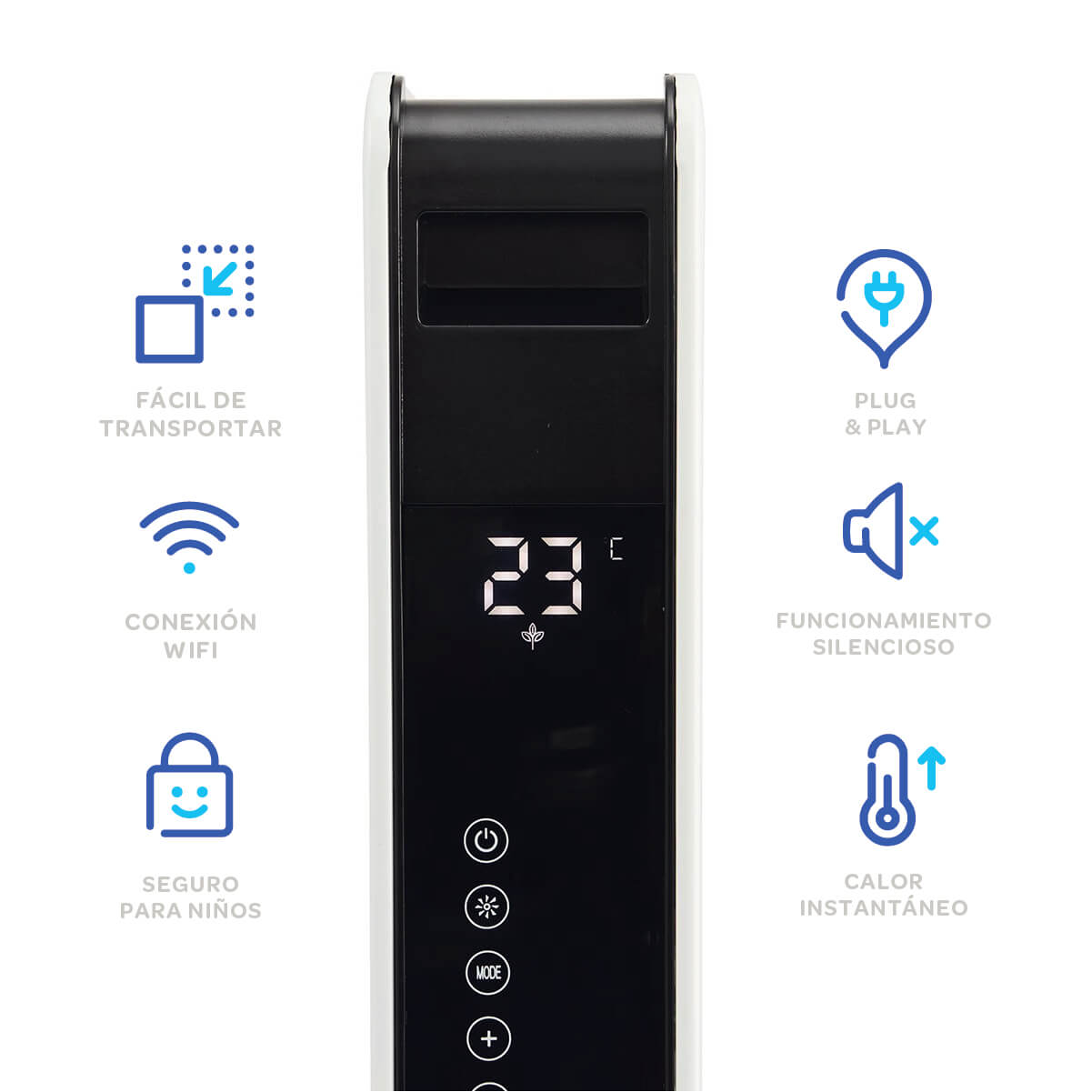 El Radiador Calefactor Convector Wifi Digital Starlife 1000-2000w Blanco PRIMATERM en color blanco de PRIMATERM es una solución elegante y eficiente para calentar espacios interiores. Diseñado para adaptarse a diferentes necesidades, permite ajustar su potencia entre 1000W y 2000W, brindando un confort personalizado. Su diseño convector favorece una distribución uniforme del calor, ideal para habitaciones, oficinas o salas. Con controles digitales intuitivos, asegura un manejo sencillo y preciso. Este Calefactor Eléctrico está fabricado para trabajar con el aire ambiente, proporciona una temperatura cálida y agradable en las temporadas más frías.