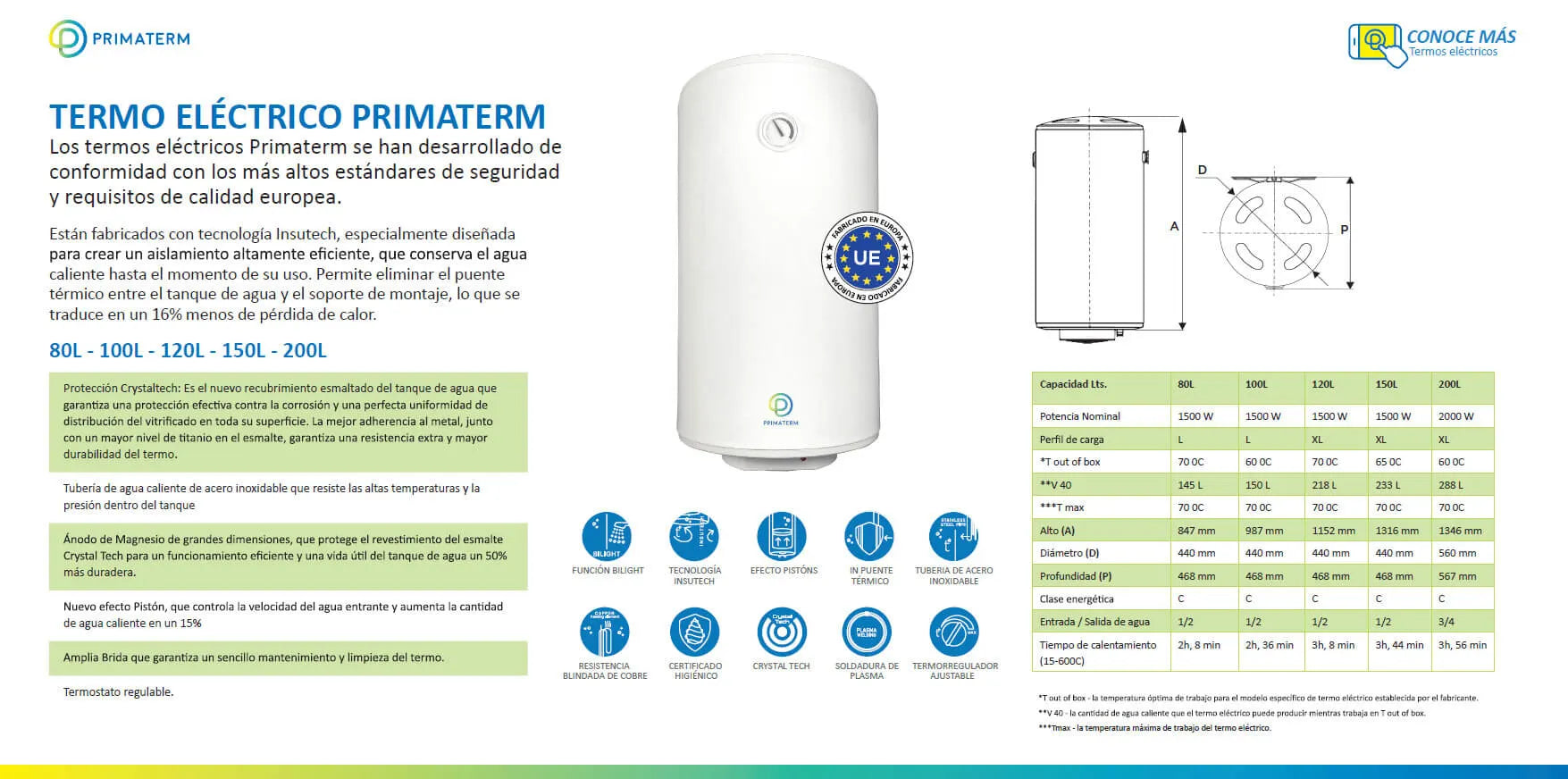 Termo Eléctrico 120 Litros 1500w 70°c PRIMATERM